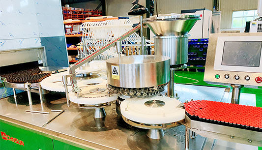該線由QCK600型立式超聲波洗瓶機、ASMR620/60型熱風(fēng)循環(huán)式滅菌干燥機、DGF600型灌裝軋蓋機三臺單機組成,分為清洗、干燥滅菌和灌裝封口三個工作區(qū),全線可聯(lián)動生產(chǎn),也可單機使用,該線融入了千山藥機自主知識產(chǎn)權(quán)的多項專利技術(shù),符合新版GMP要求。。